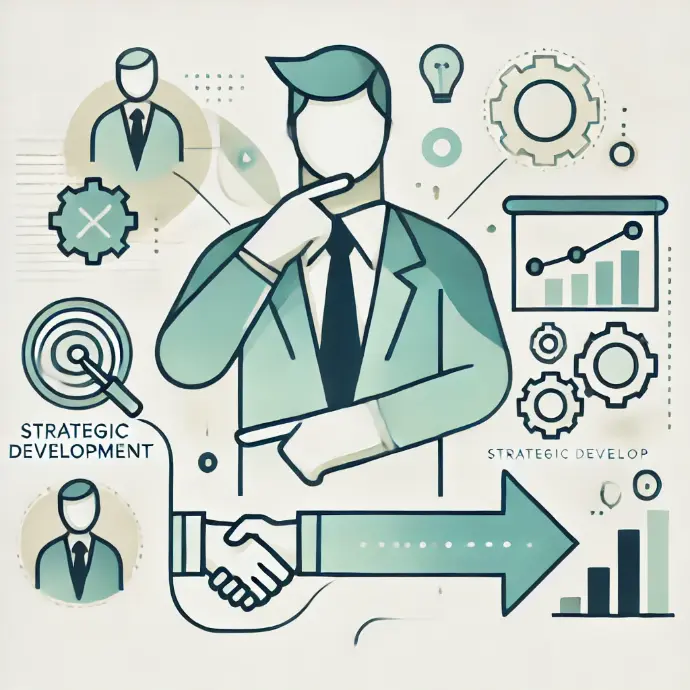 توسعه استراتژیک به طراحی و اجرای برنامههای بلندمدت برای رسیدن به اهداف کسبوکار اشاره دارد. این شامل تعیین اهداف، تحلیل رقبا، و ایجاد استراتژیهای رقابتی است.